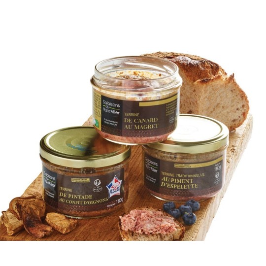 3 terrines 180 g : terrine de pintade au confit d’oignons, terrine traditionnelle au piment d’Espelette, terrine de magret de canard